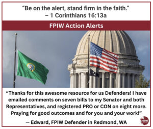We shall never forget this Legislative Session. With the upgrades to our Defender App, as well as our daily ‘Action Alerts’, our influence across Washington state has increased substantially. We have been delighted to welcome many thousands of new people onto the Defender Team. This growth has us excited, and we are already preparing for the upcoming 2027 Legislative Session. We are currently putting the finishing touches on our brand new FPIW Bill Evaluation System which will allow us the capacity to consistently evaluate even more bills next year. Finally, a heartfelt THANK YOU to all of you who shared this strenuous two-month journey with us. We aim to be found faithful to our calling from the Lord to “be on the alert, standing firm in the faith” (1 Corinthians 16:13a).